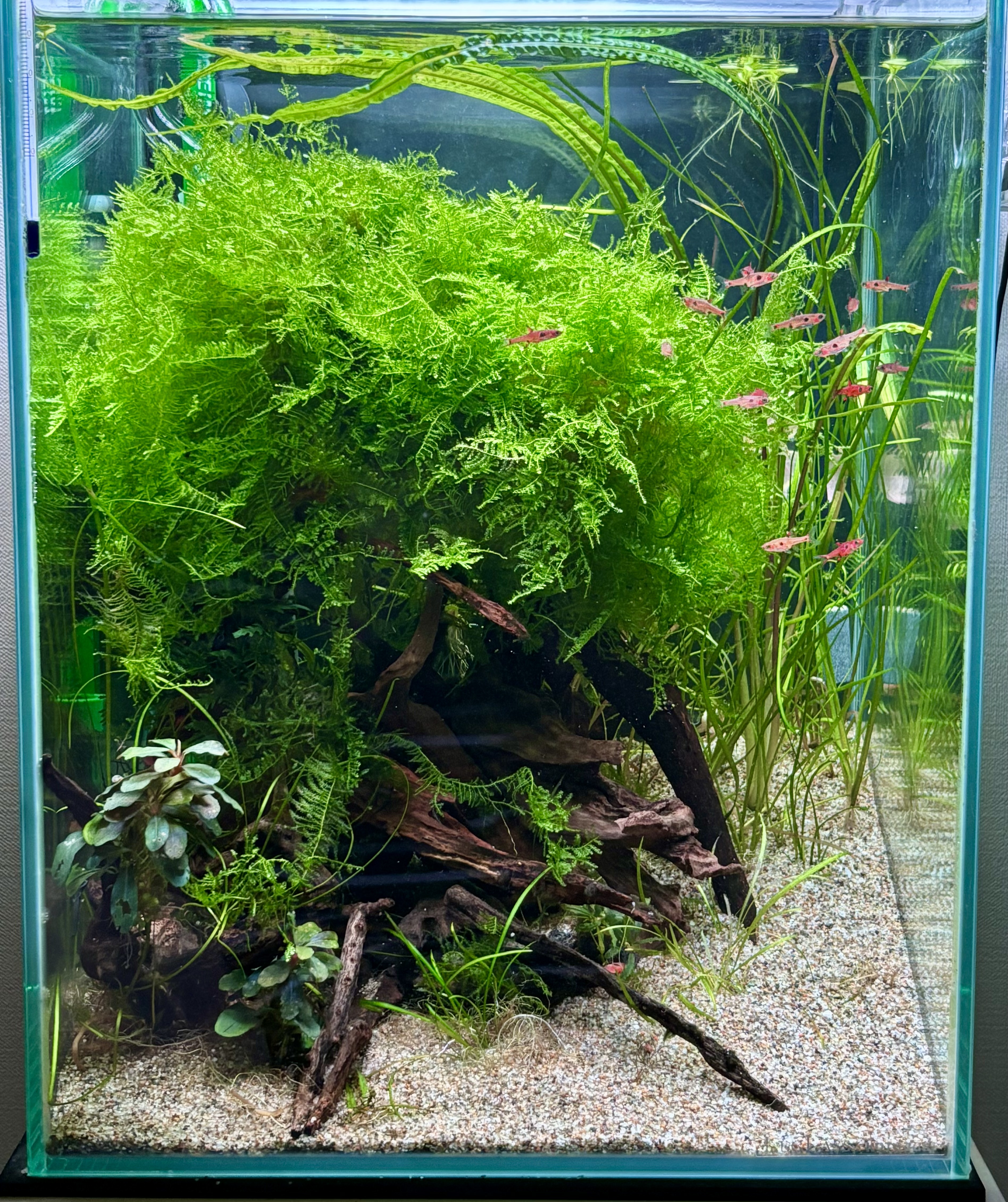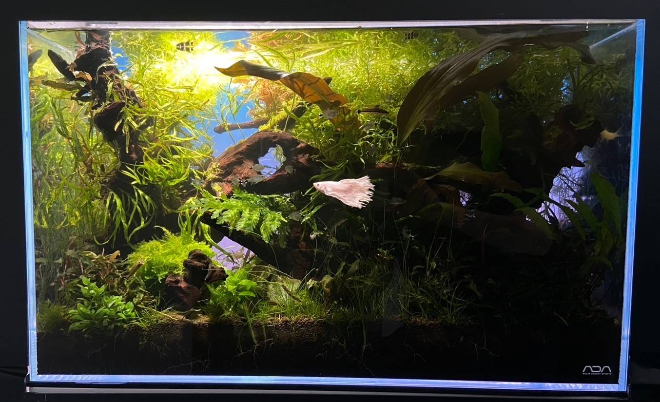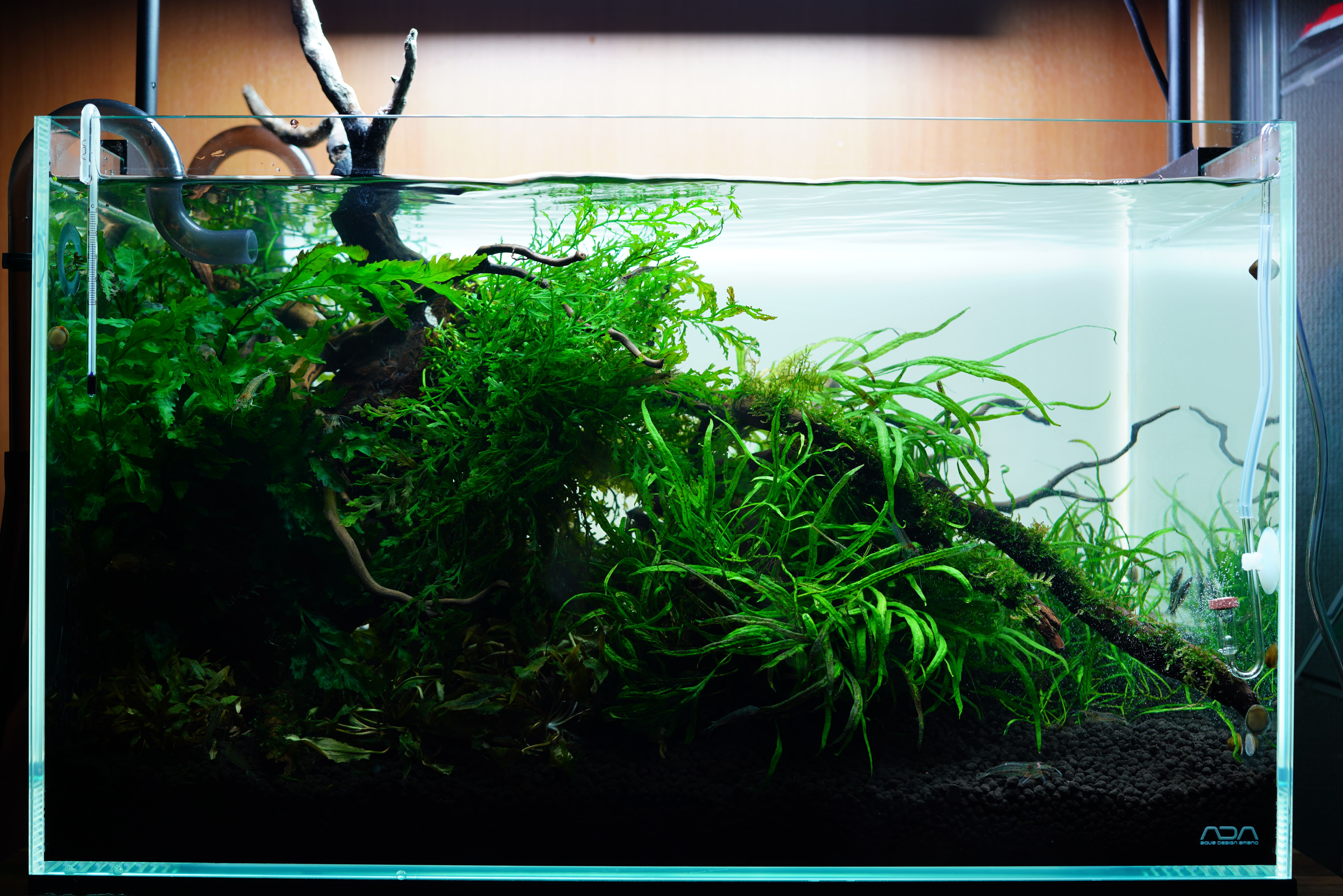 作品コンセプト:多種の陰性水草を配し、それぞれの質感を際立たせることで、光と影が織りなす静謐な景観を表現しました。水流に揺らめく葉は時間とともに姿を変え、訪れるたびに新たな表情を見せてくれます。流木や水草の陰は魚たちにとって安心して身を寄せられる憩いの場となり、影にひっそりと安心できるような優しい空間を目指しました。