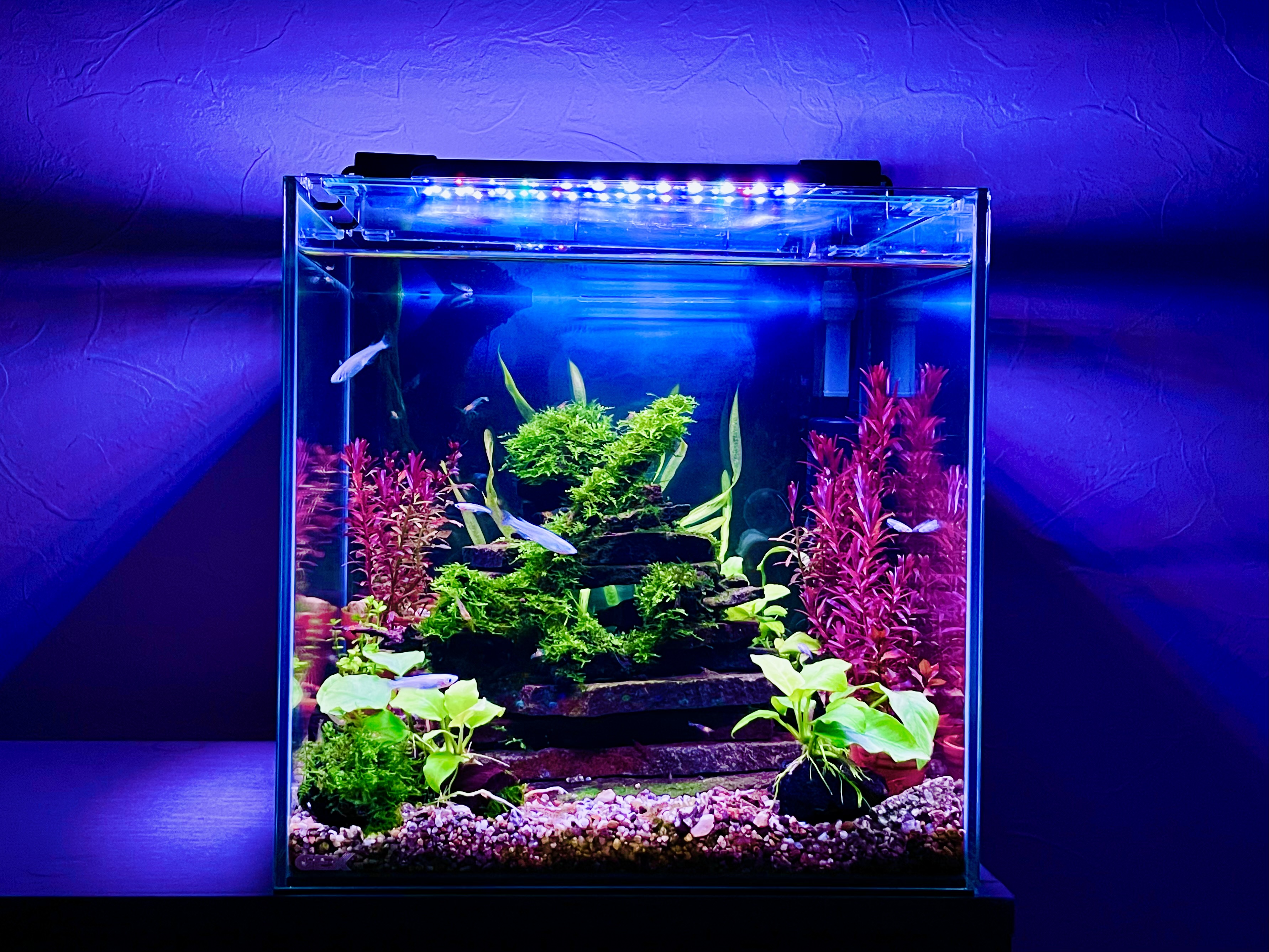 作品コンセプト:我が家のキッチンカウンターにある、幅60センチ、奥行き20センチの空間にぴったり収まるGEXグラステリアスリム600。食卓で夕食を待ちながら水槽越しに妻が料理をしている姿を覗くのが、穏やかな週末の夕げのささやかな楽しみです。長く食卓で楽しめるよう、昨年の作品をリセットせずにリニューアルし、メンテナンスが容易な水草をアレンジしています。オリジナルの作成から2年半。我が家の食卓を楽しく、穏やかに、そして彩り豊かなものとしてくれています。