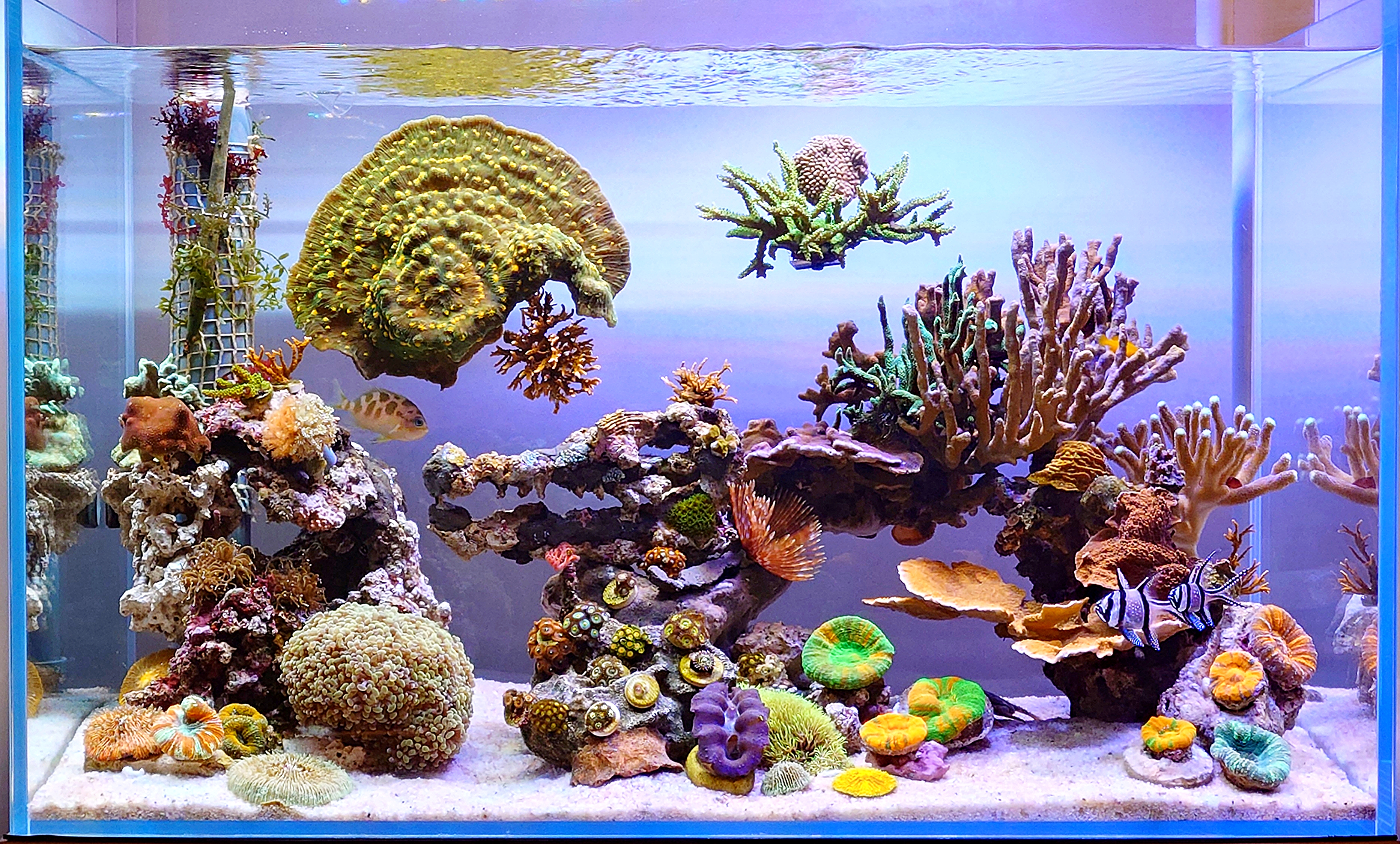 フローパイプにはチャーシューネットを取り付け、海藻やマングローブを簡単に配置出来るような工夫もしてオリジナルなレイアウトを楽しんでいます。