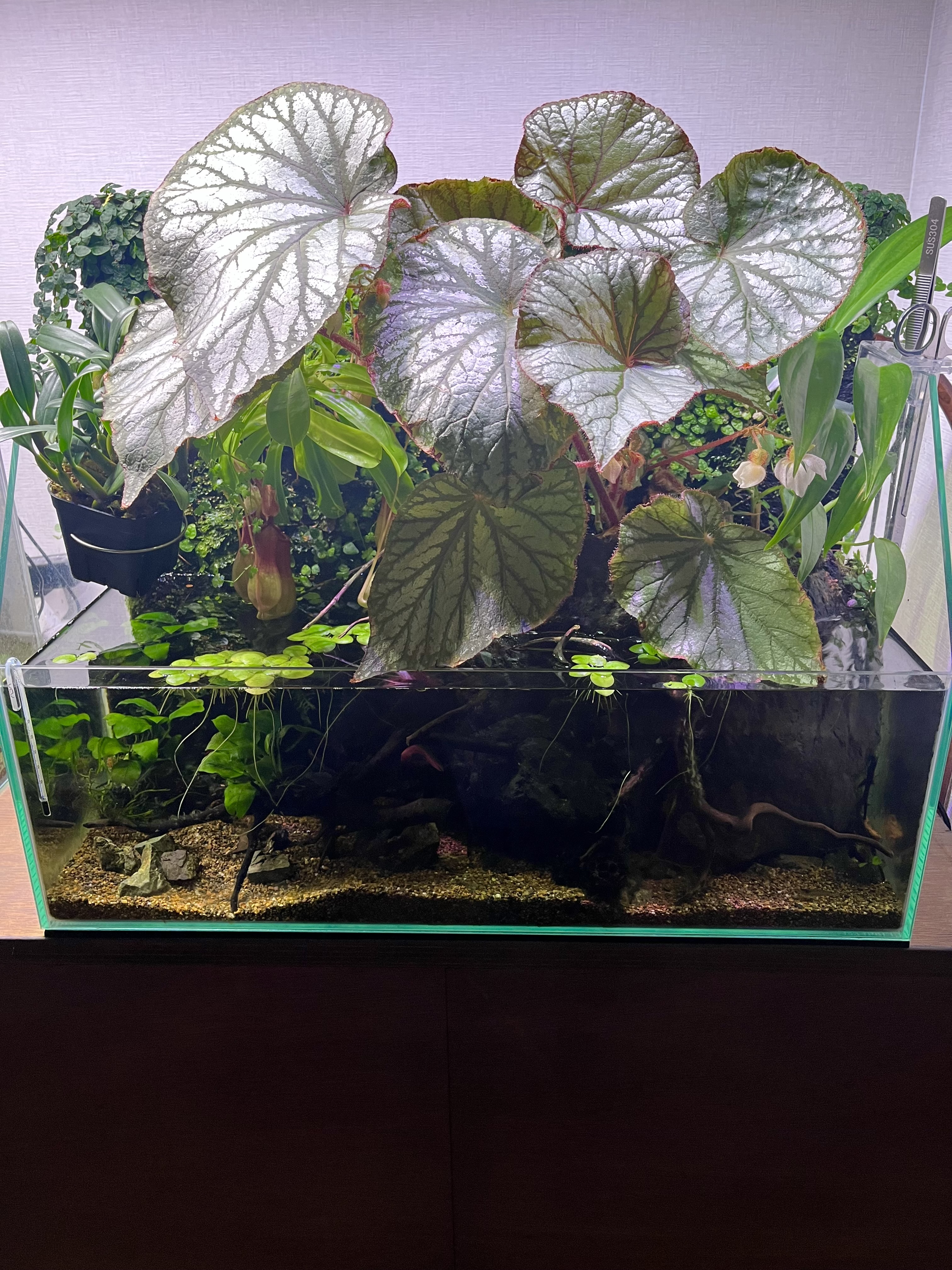 作品コンセプト:水上部は大きな原種ベゴニアを中心に原種ラン、ネペンテス、ヤマサキカズラなどが共生し石肌を伝って小さな滝が流れています。水中はブラックウォーターで珍カラが住んでいます。水草は陰性水草のみで管理がしやすい水槽を目指しました。
