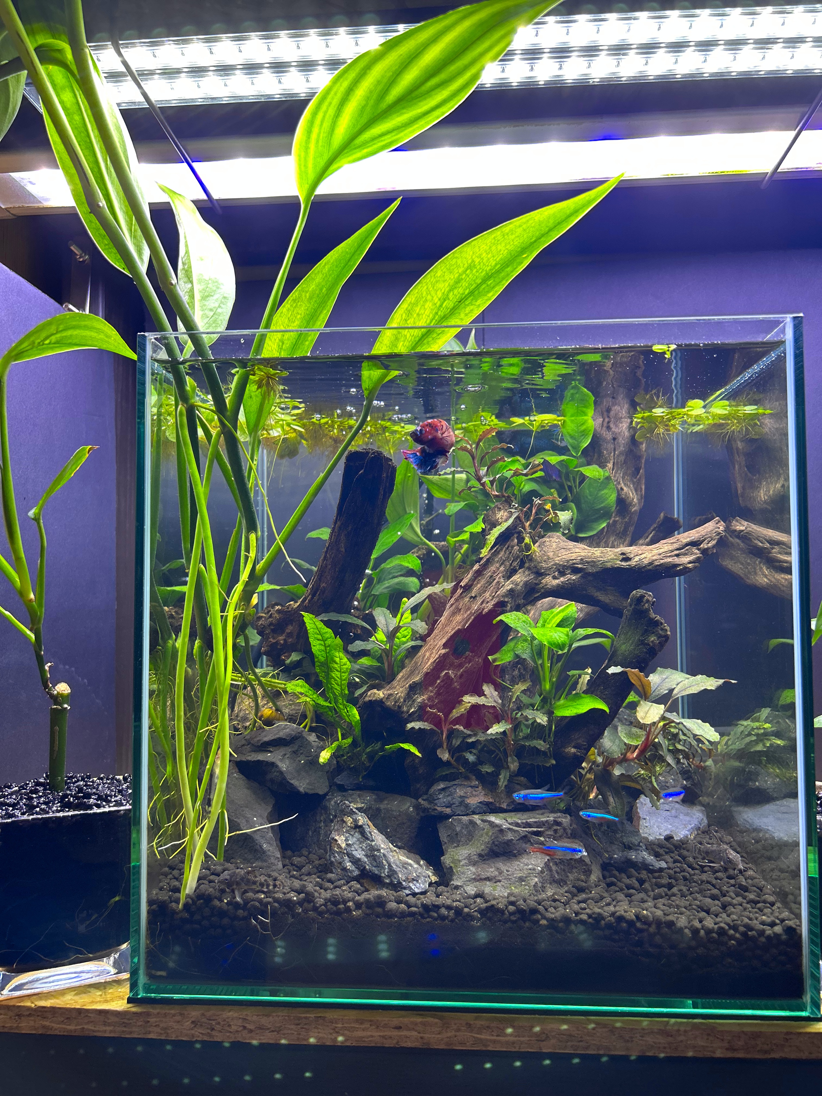作品コンセプト:30センチキューブ水槽で、ベタ(闘魚)のメスを主役にした作品です。