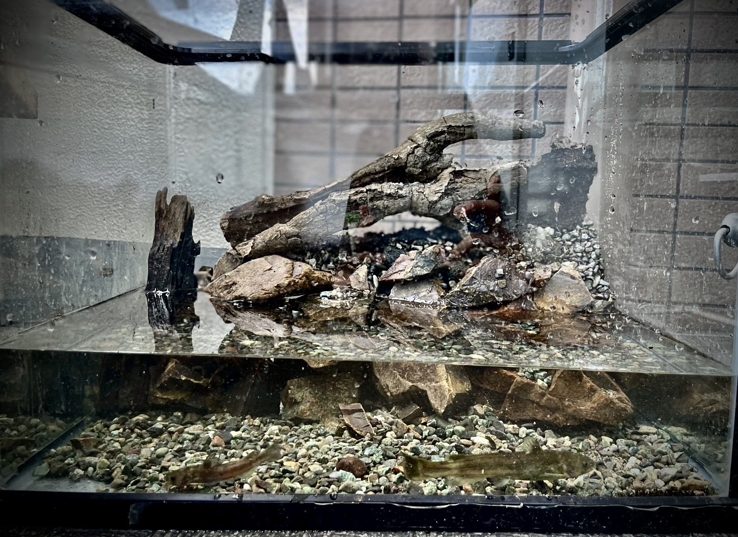 また今回は流木や立木などを入れて河川敷を再現しました。立木にはヒラタクワガタ、流木{土手}にはアカテガニを入れました。