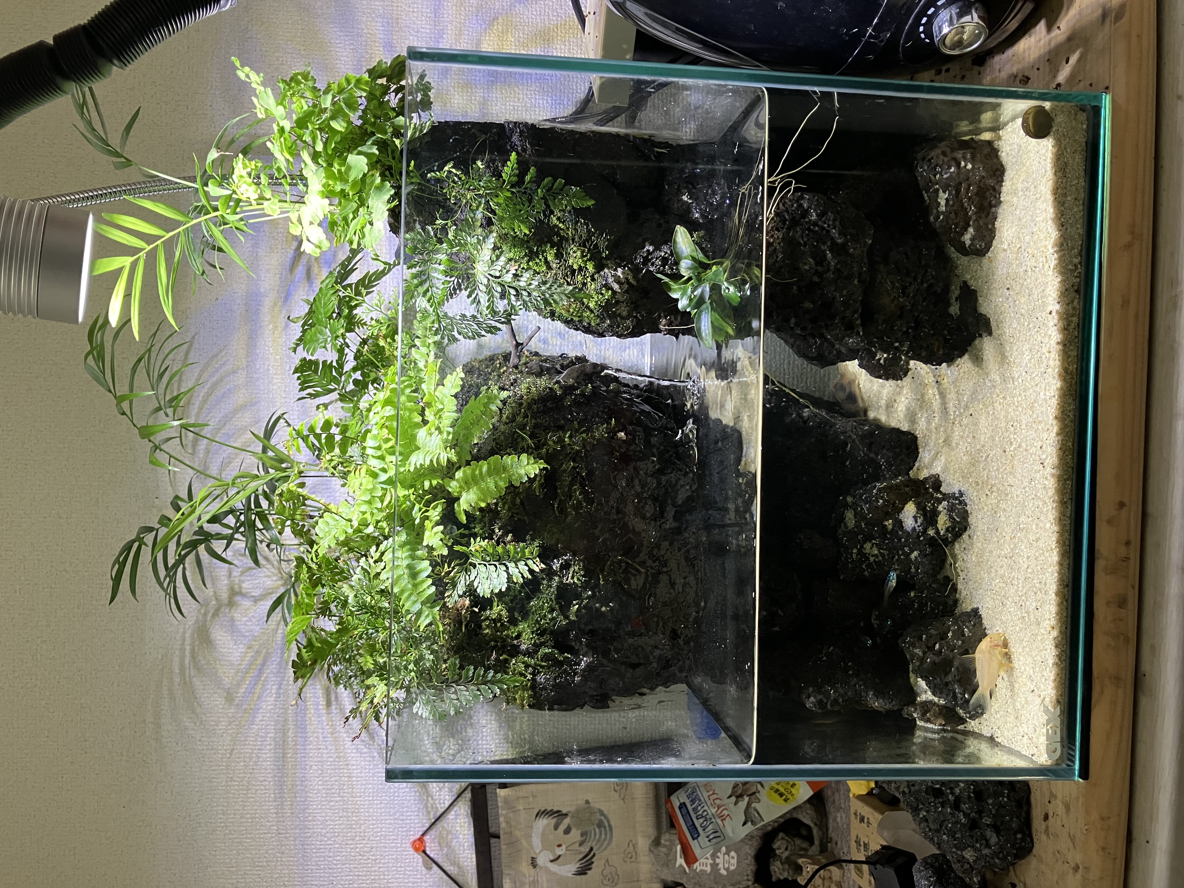 この水槽はスリム型の水槽で、奥行きが16cmしかありません。そのため少しでも奥行きを感じるために、溶岩石で高さを盛ったり、ソイルを高く積むことにより、化粧砂エリアとの高低差を演出しています。