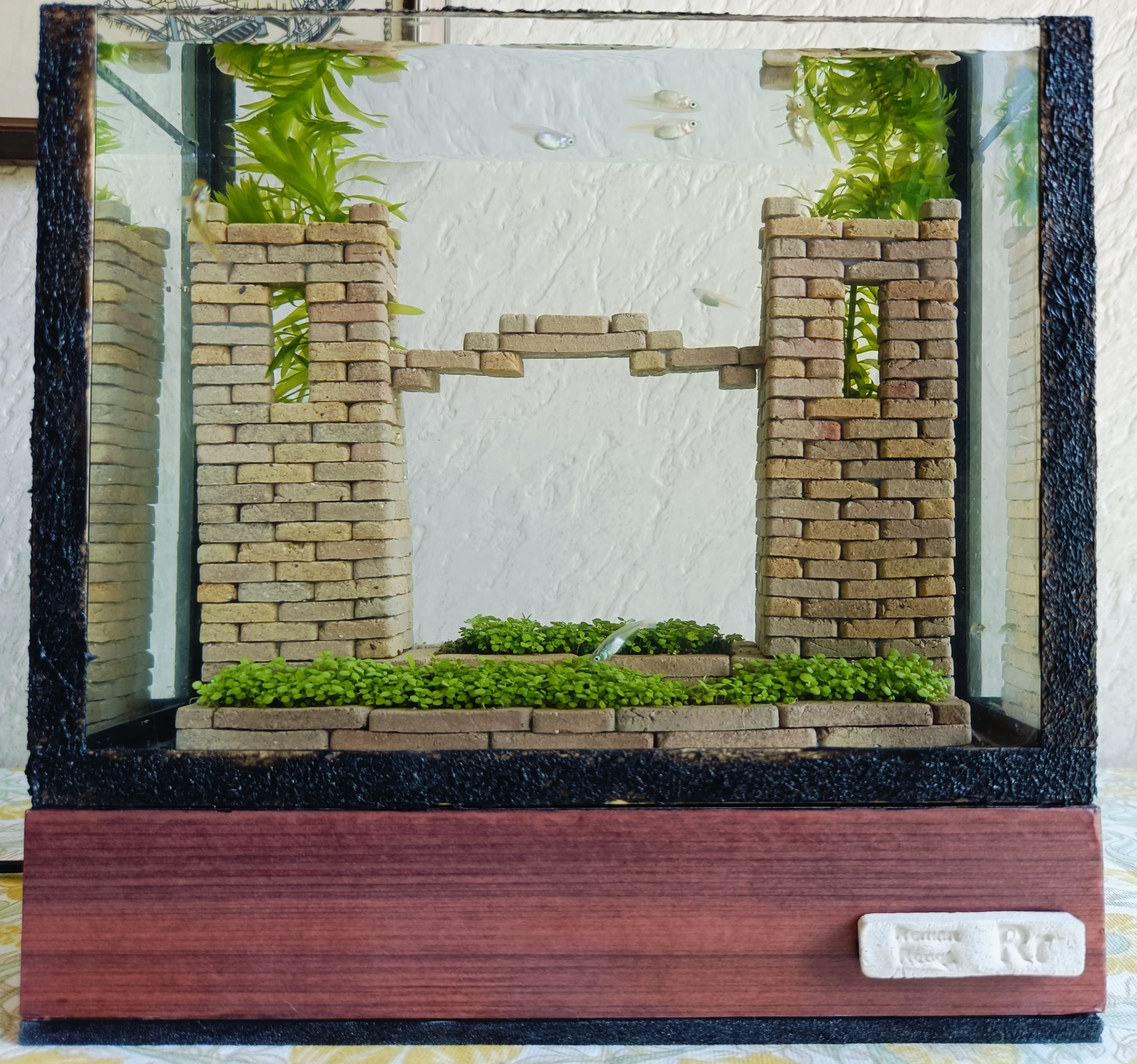 作品コンセプト:ミニチュアレンガを使用し水槽内に庭園を作ってみました。二つの塔からなるお城と芝生が生えた庭園をイメージしています。お城内部にメダカが入ったり出たりして遊んでいたりします。水槽も小さいものなので玄関やデスク横に置いて楽しんでいます。