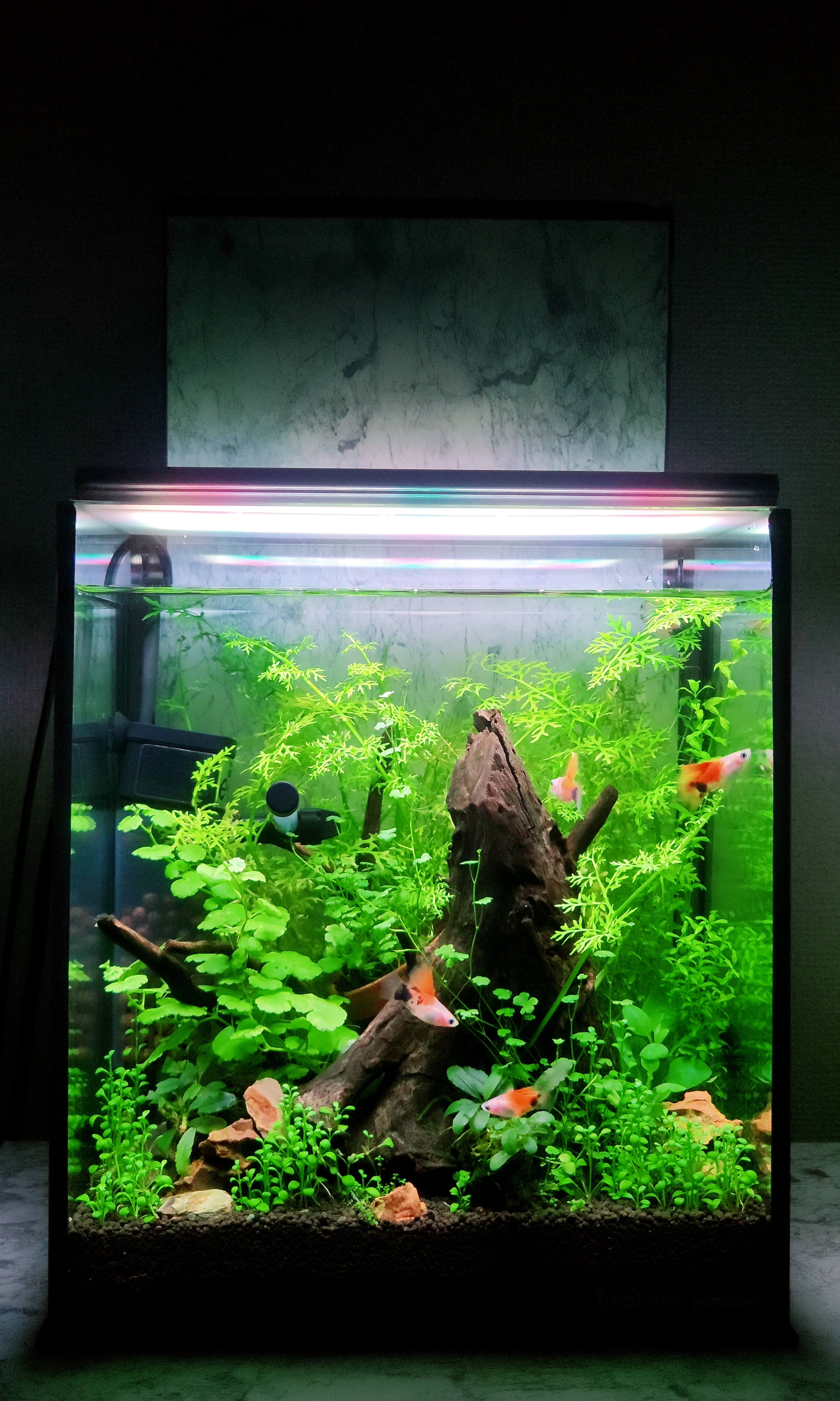 また、水流は弱め水草を繁らせることで、プラティの自然繁殖を期待できるレイアウトにしています。