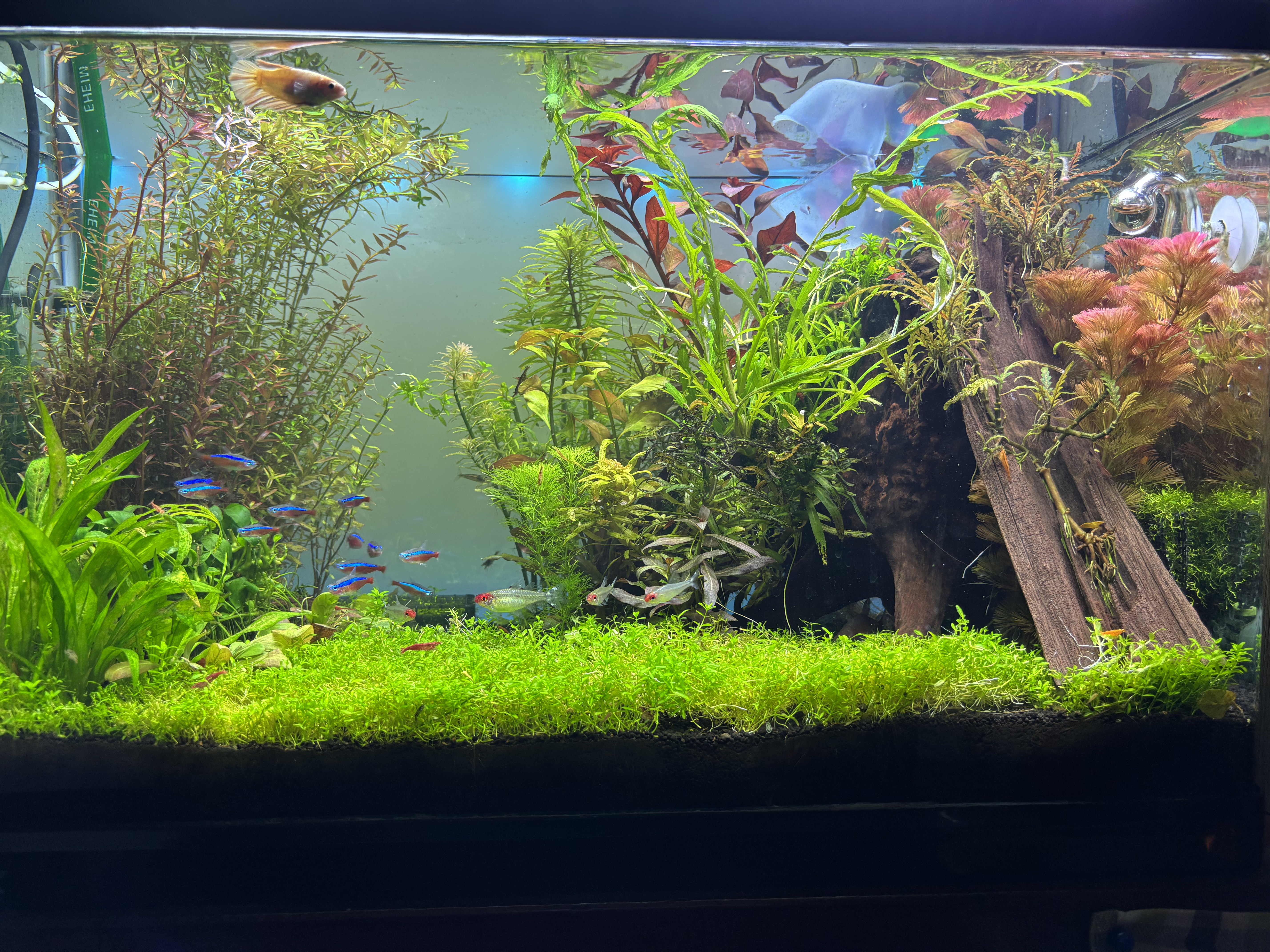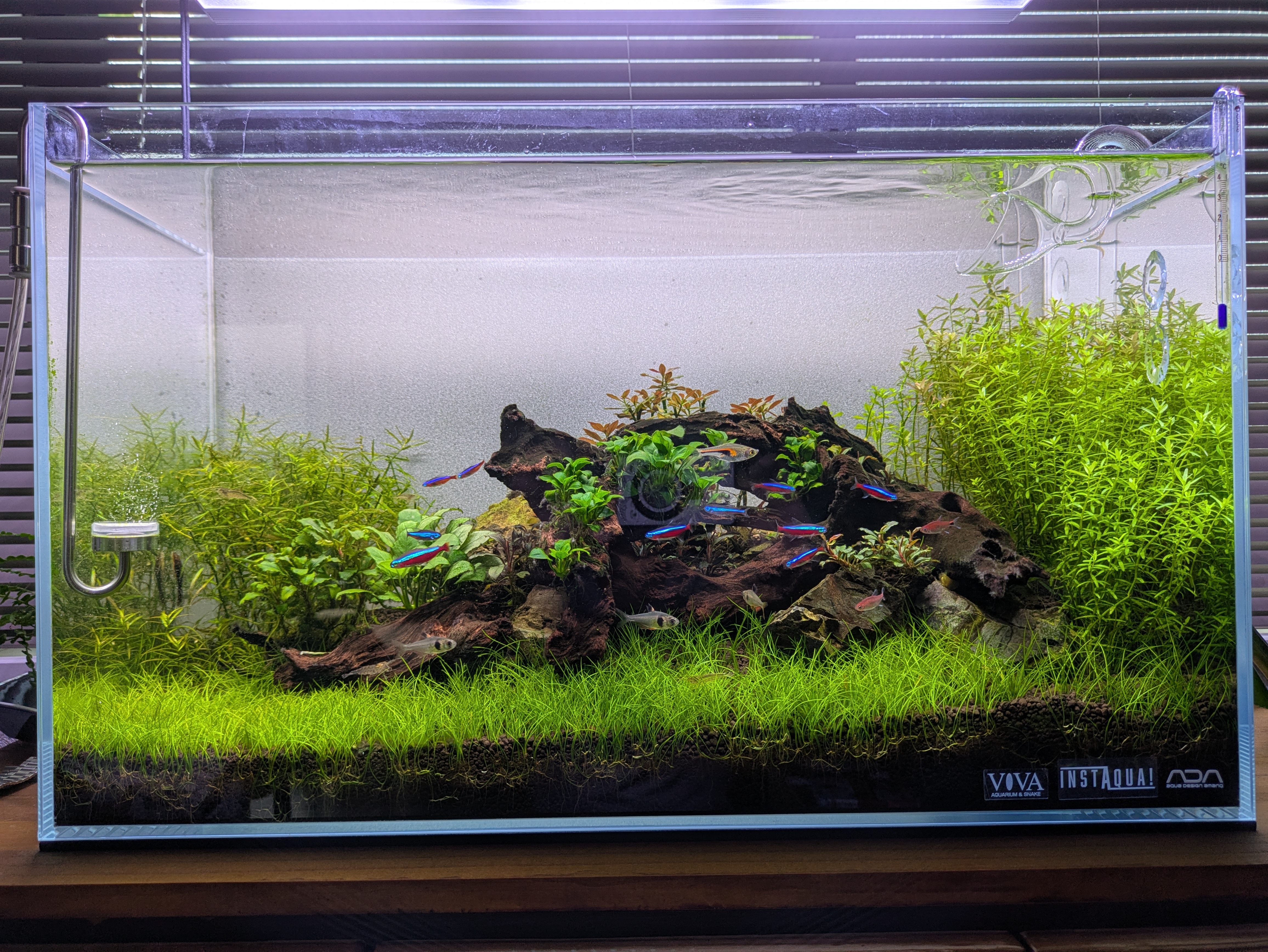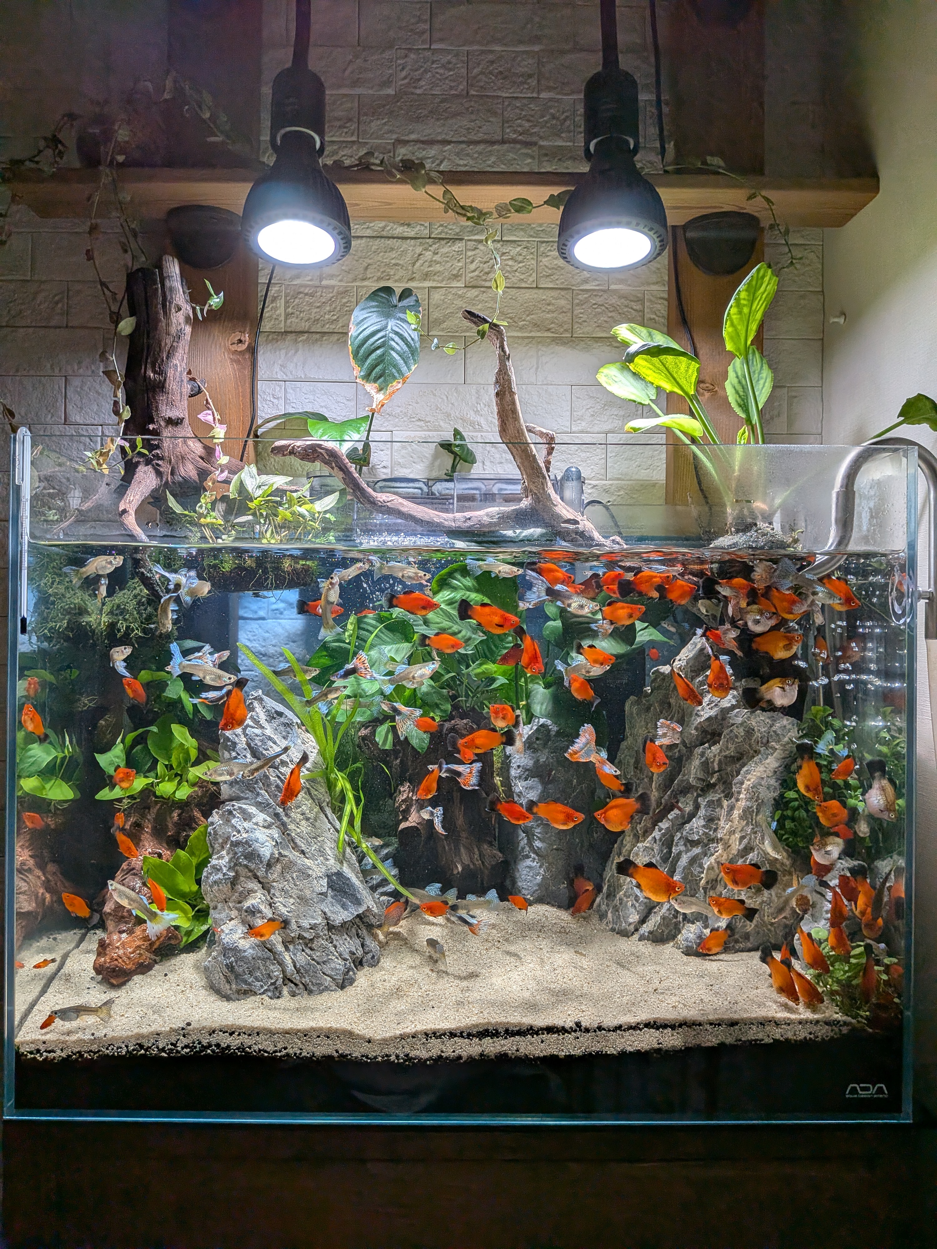 や丘のようで、そこに集うカージナルテトラたちの青い 光が、この小さな世界に生命の彩りを添えています