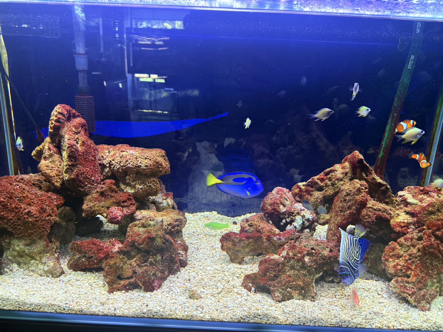 作品コンセプト:この水槽には、海の音楽が静かに流れています。魚たちはそれぞれ違った音色を持つ楽器のように、自由に泳ぎながら景色を彩り、ライブロックはその音をやさしく受け止めるステージのような感じになります。水の流れと光がそっと指揮をとり、時間とともに旋律がゆるやかに変わっていく海の静かさを作りました。