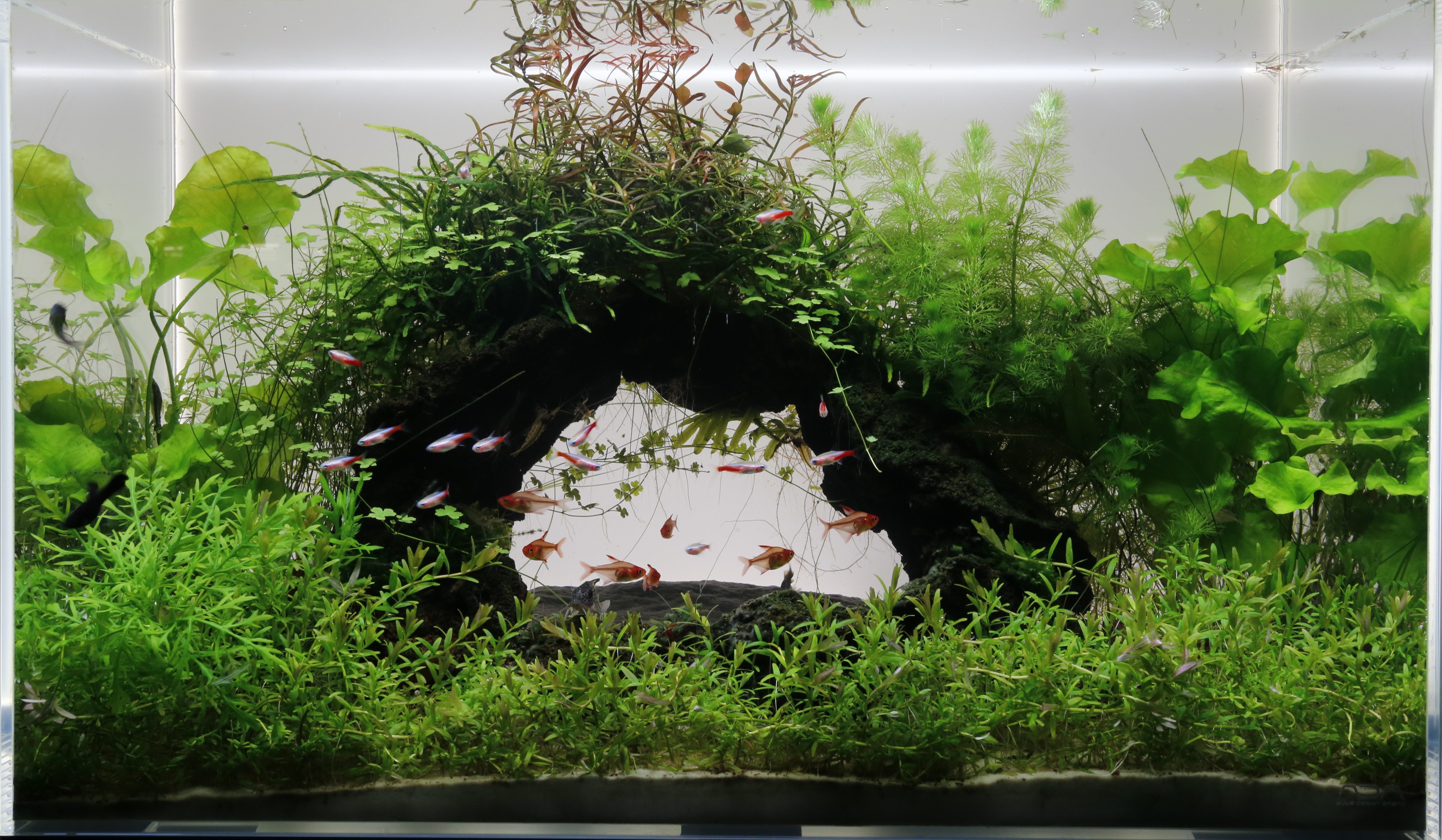 こだわりのポイントは中央下部に設けたトンネルで、魚が行き来するのが見てて飽きない水槽になっています。陰性水草水槽でよく用いられる山谷石ではなく、明るい色合いの龍王石にすることで、爽やかで清潔感のある水景にしてみました。
