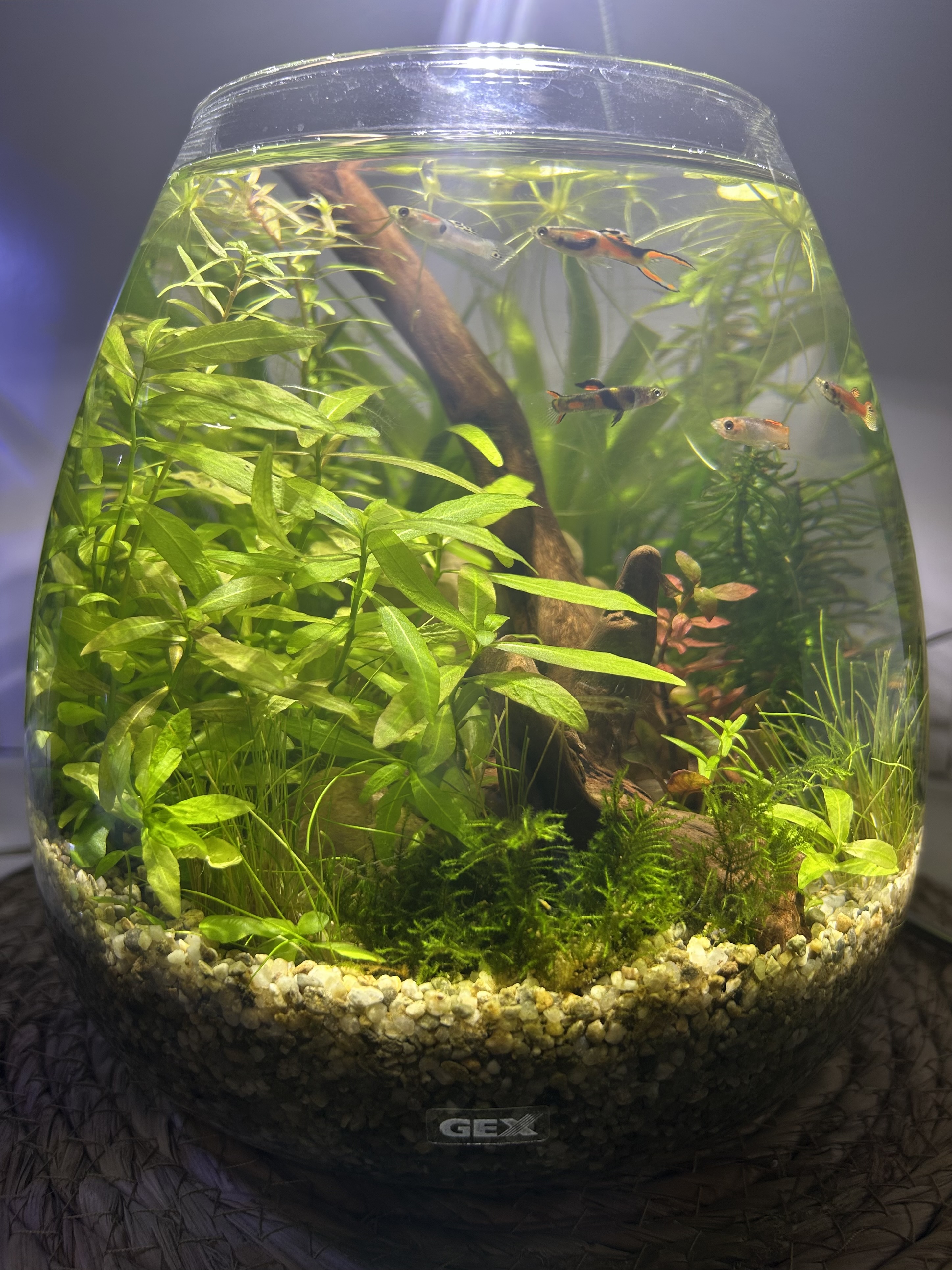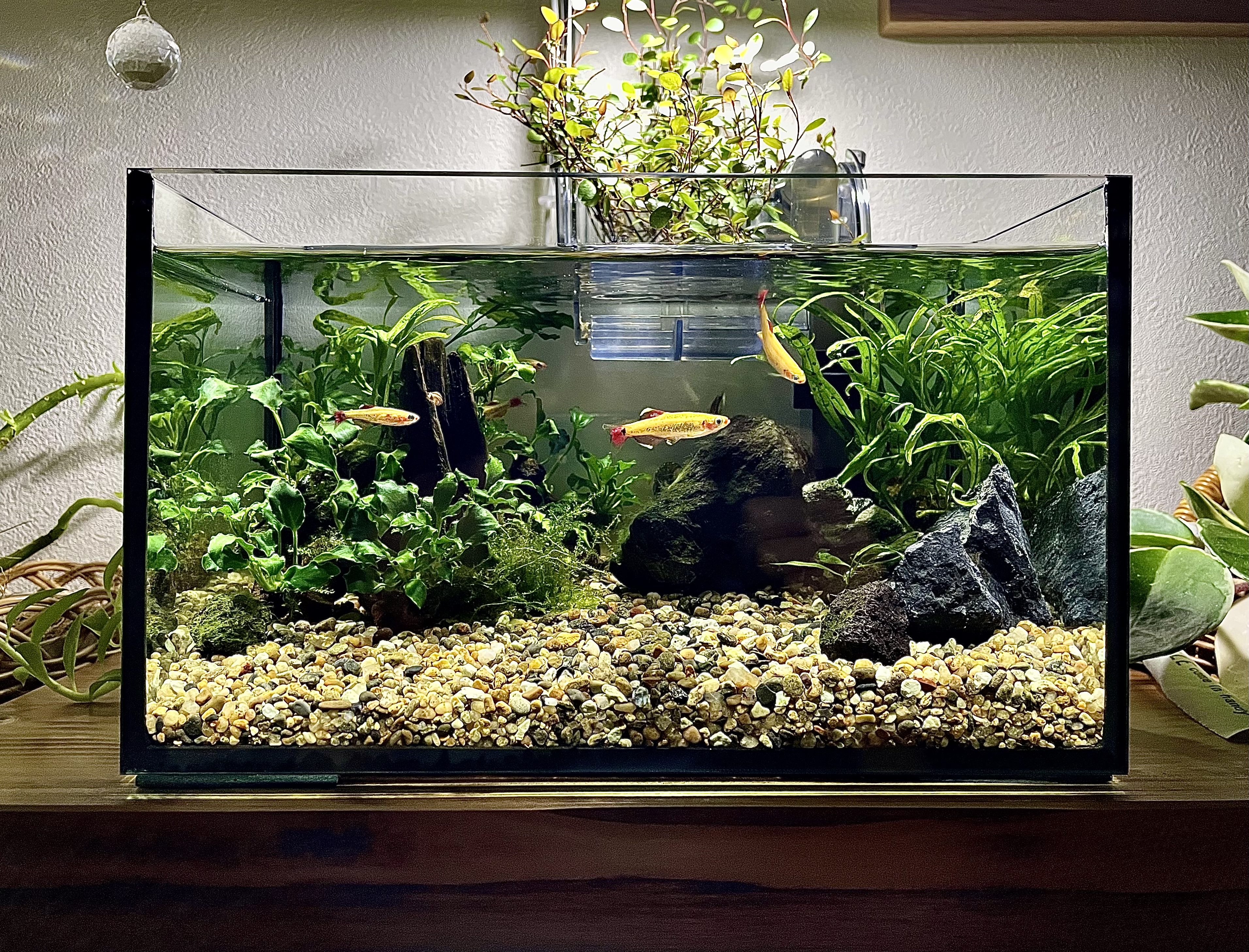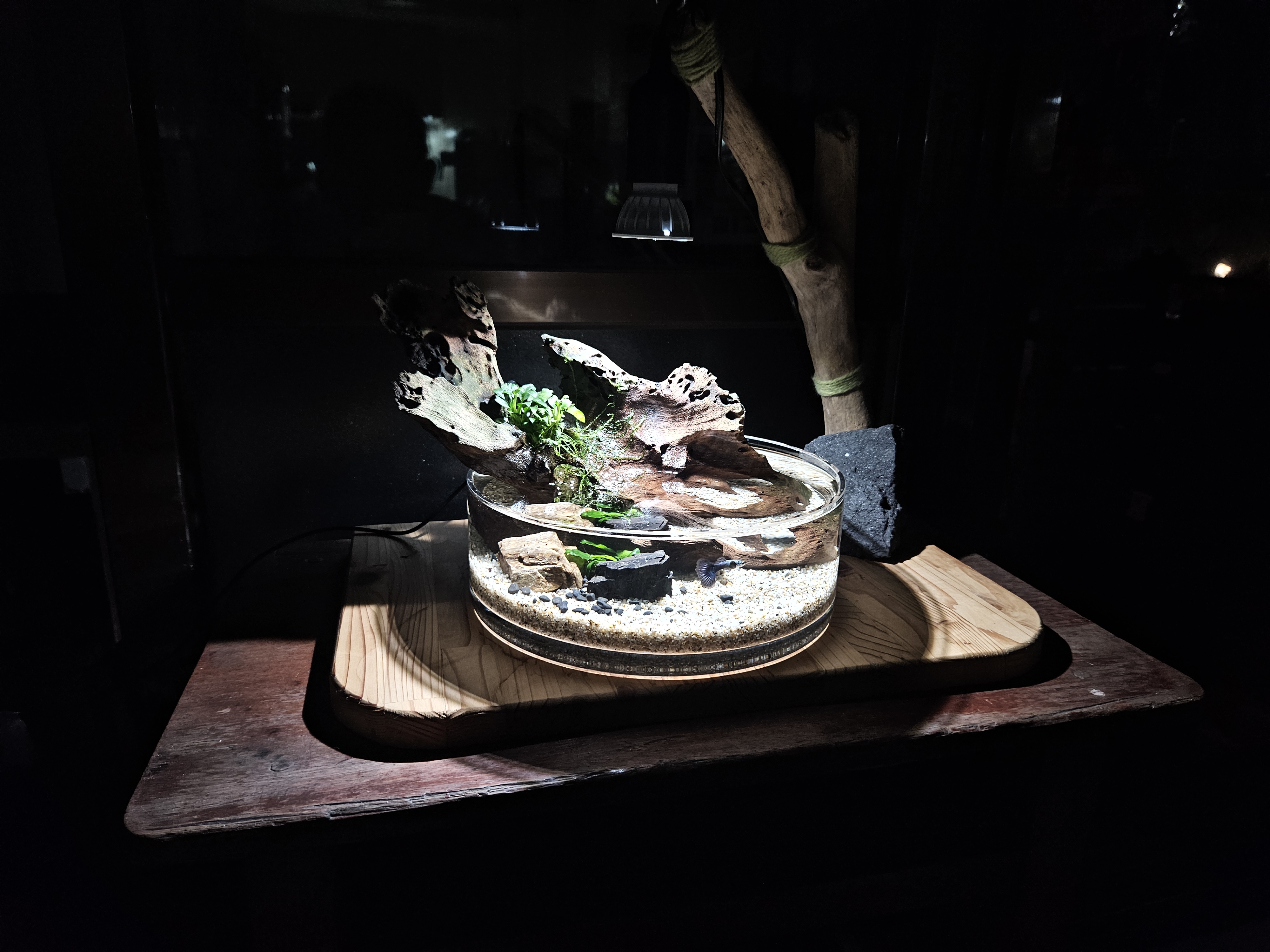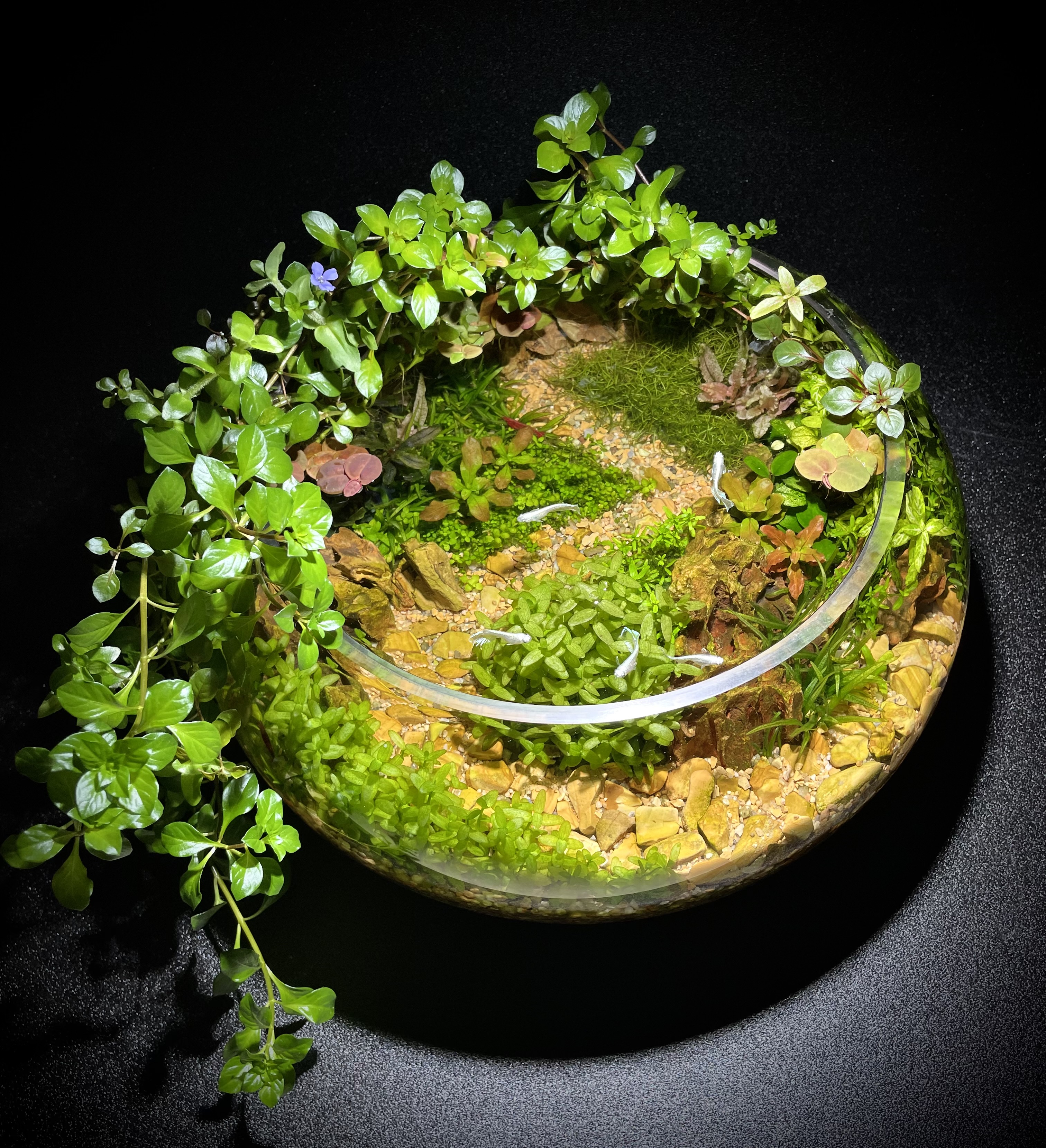 作品コンセプト:小さいけれど、好きな魚も好きな水草も全部詰め込んでみました。先に水槽作ったので、この水槽で楽に飼える魚を~と、探しに行ったときに「飼える魚より飼いたい魚を選んでみては?」と言われ、はっとしました。メンテナンスもこまめにしなきゃだし、手はかかるようになったんですが好きなことを詰め込んだ水槽は本当に楽しいです。