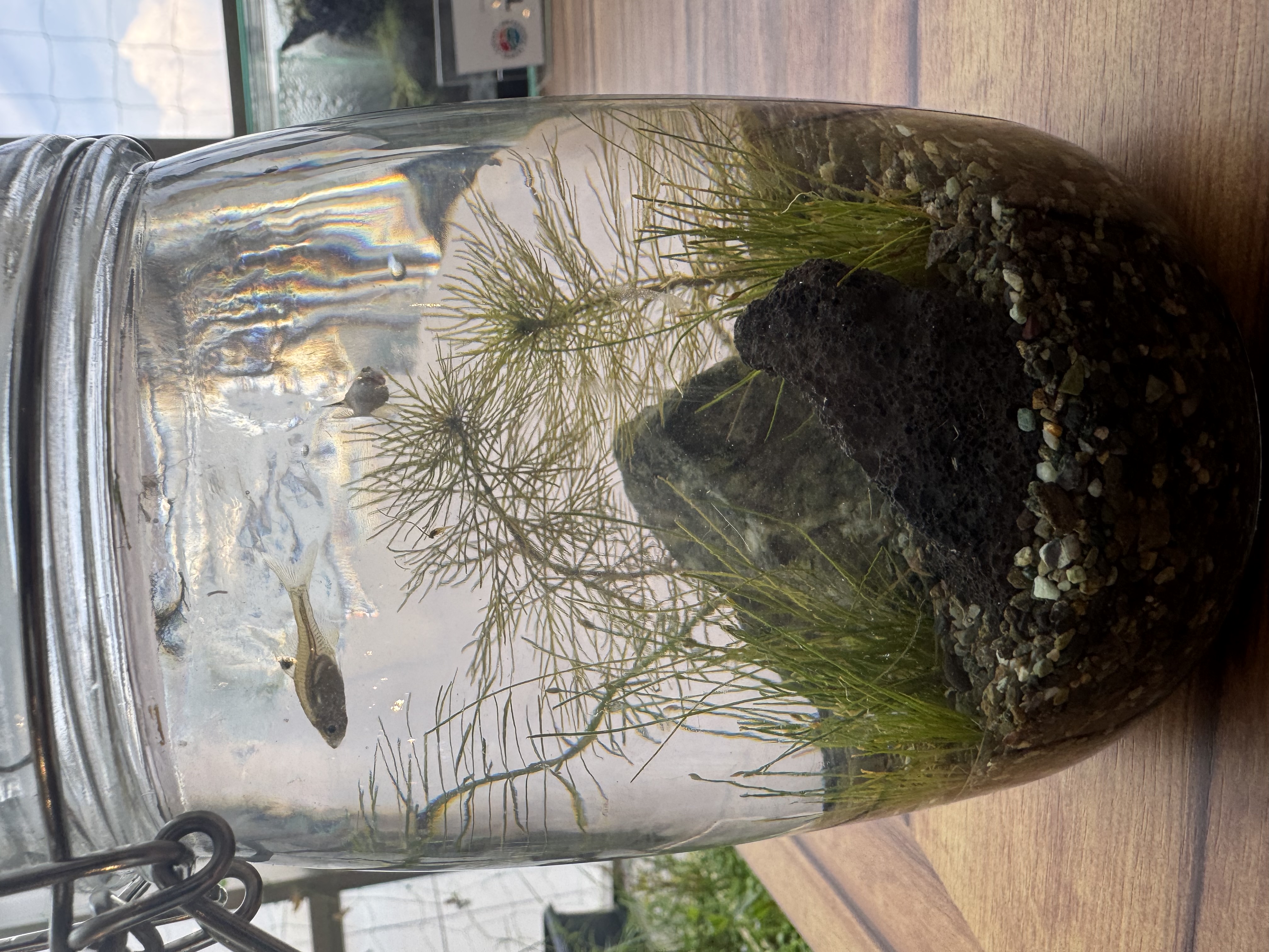 水草の陰には稚エビが、そしてこのグラスアクアで生まれ育ったメダカたちが、