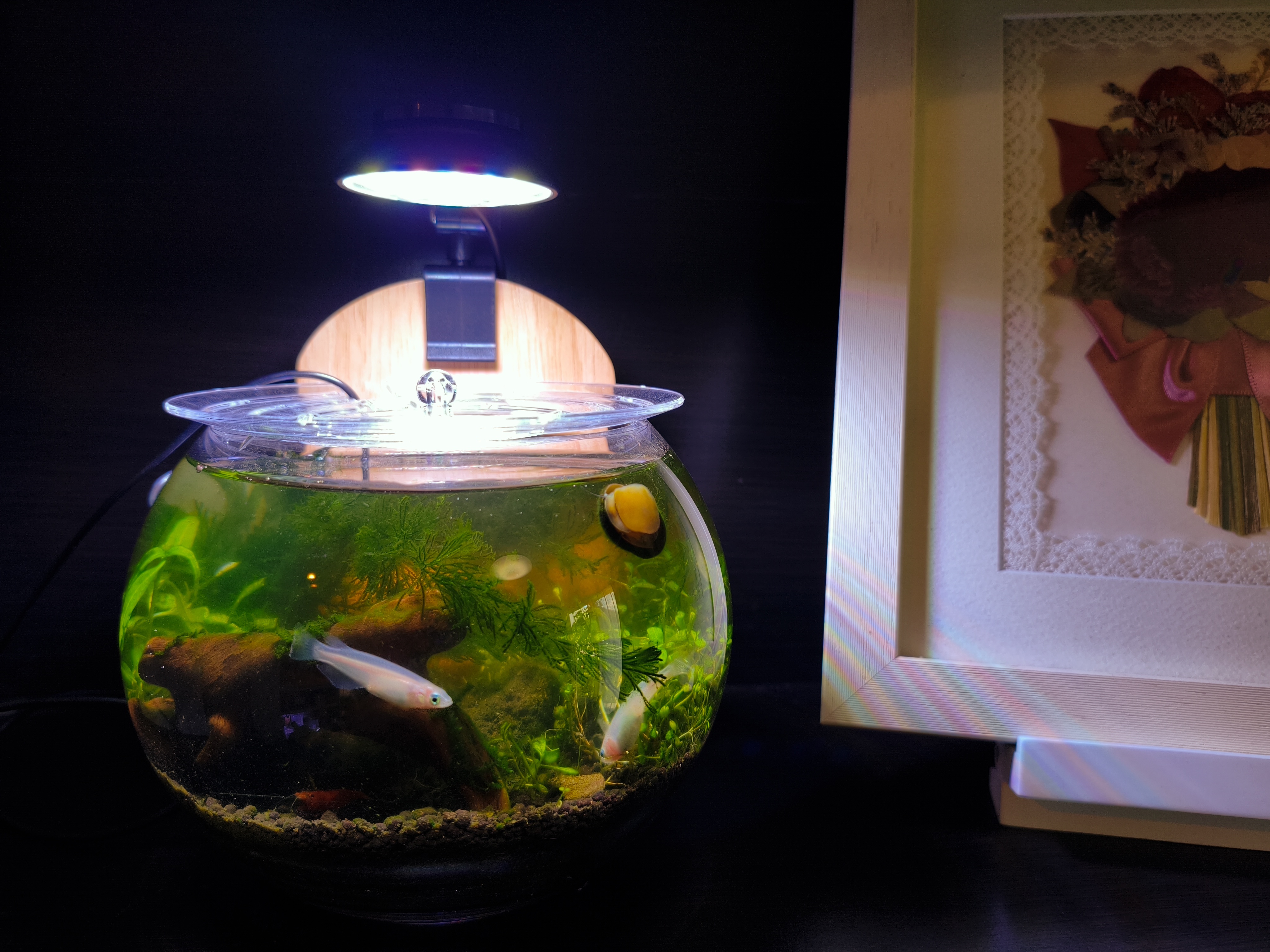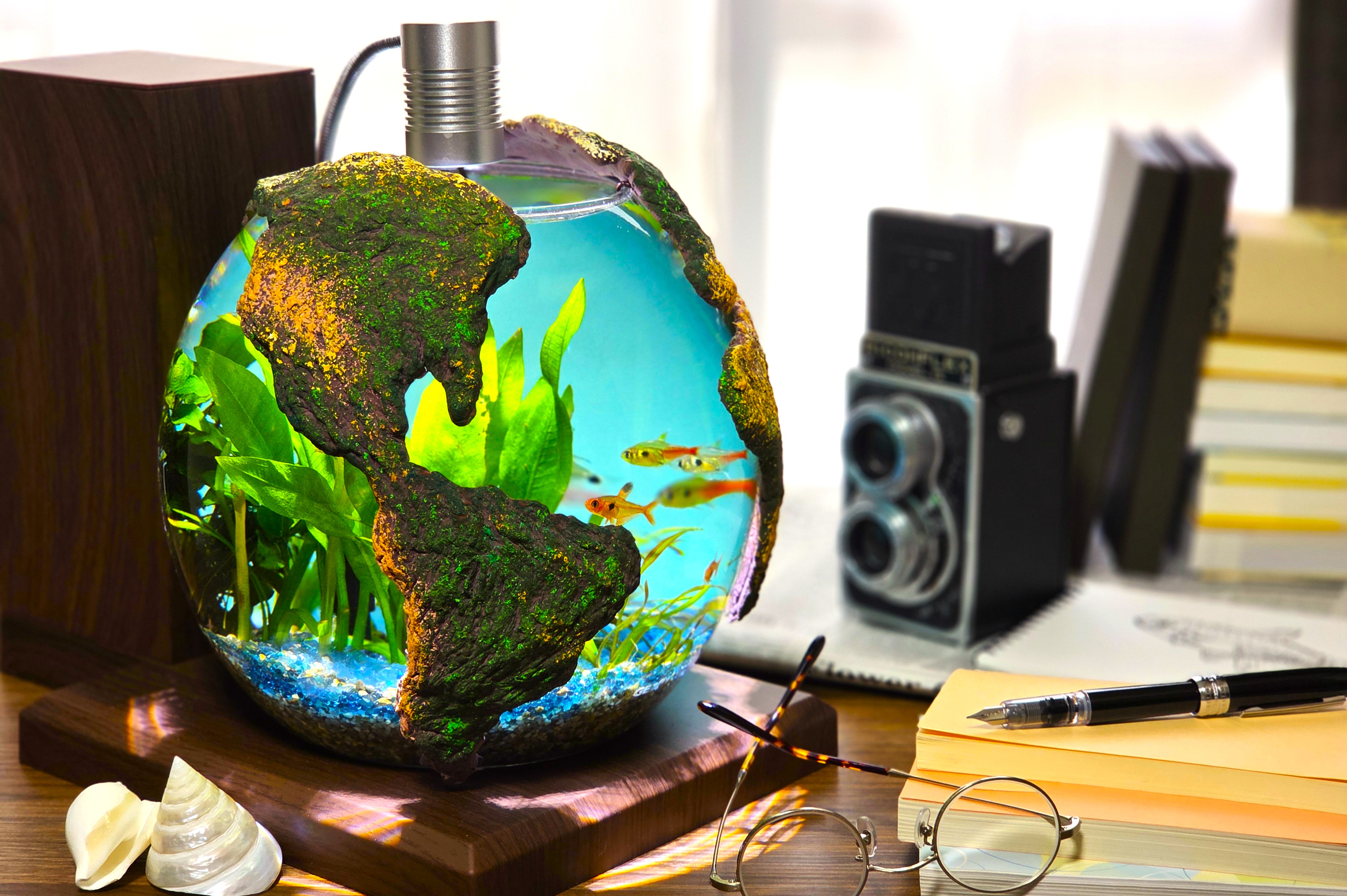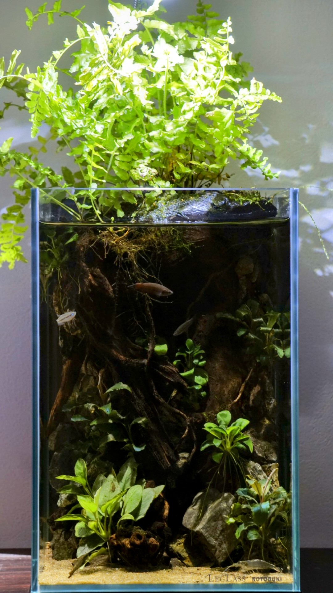 作品コンセプト:生体の暮らしやすさを第一に考えて、その次に日常の中でも人が見て楽しめるように作ってみました。アクアリウムとしての鑑賞性は薄いかも知れませんが、白メダカやチェリーシュリンプ、イシマキガイが動く姿を楽しみながらみています。