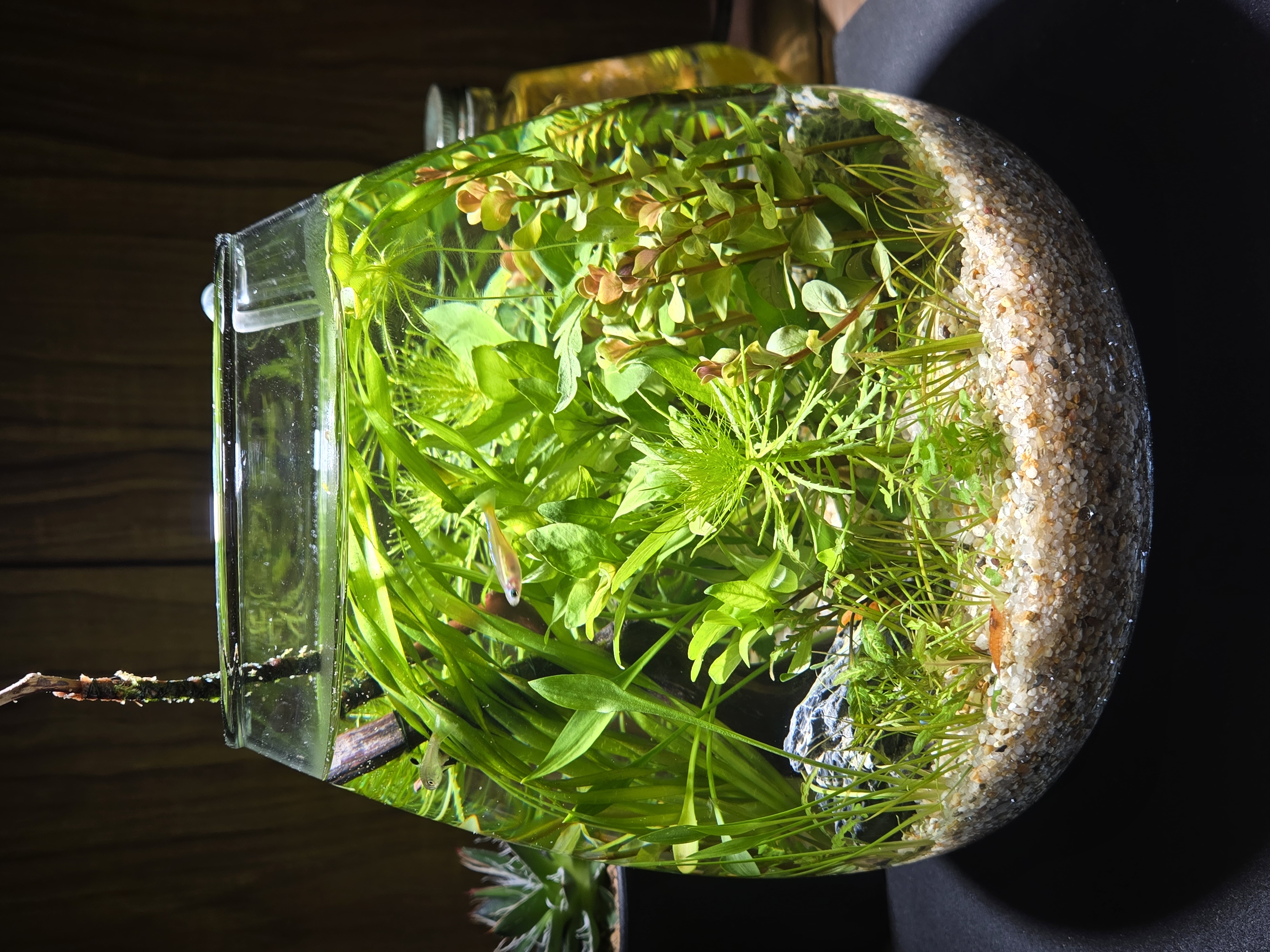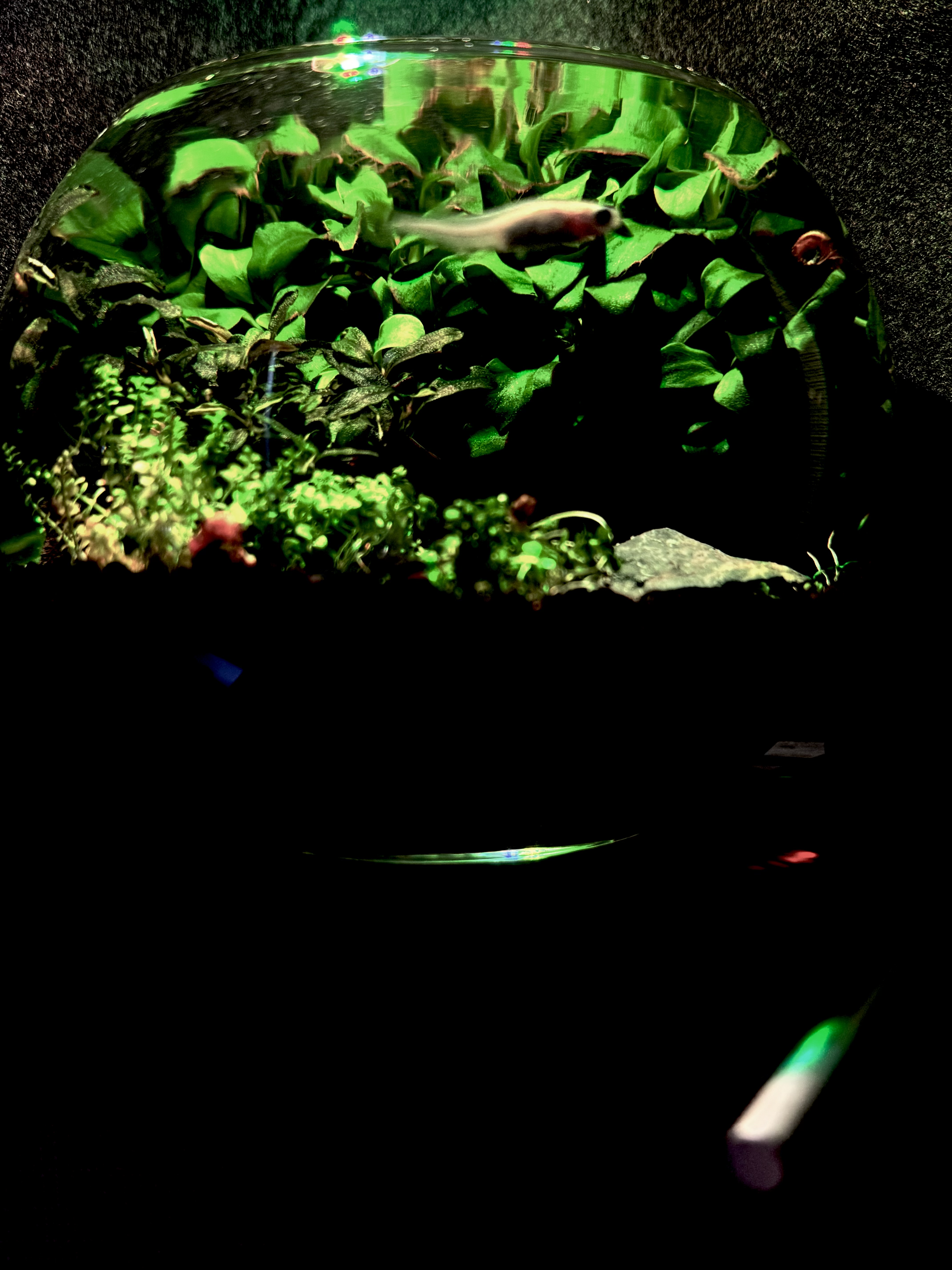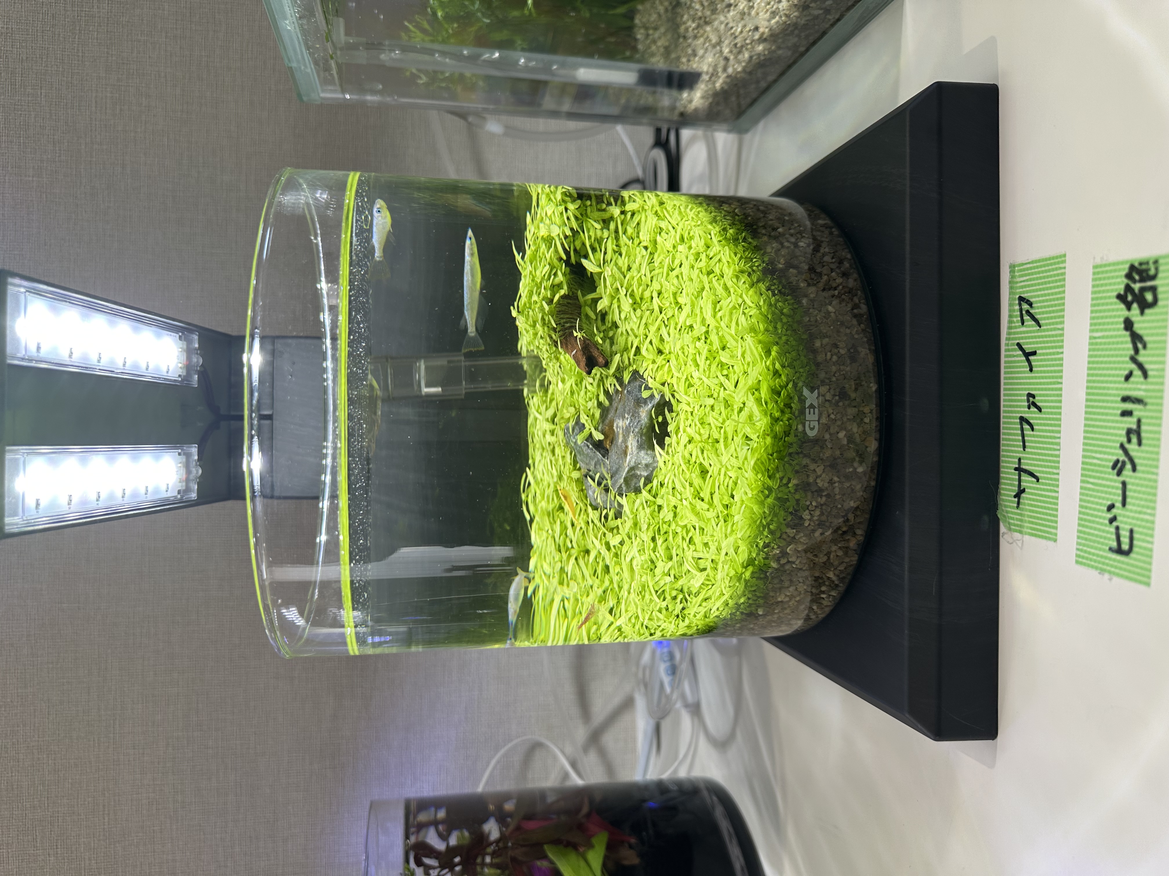 作品コンセプト:小学2年生になる子供が春にメダカを飼いたい!と言い出して、一緒に飼い方を調べ始めました。私自身が小学生のときに、金魚やメダカを飼っていたことがらありましたが、その時代とは全く奥深さが違いました。。。調べれば調べるほど、水景の奥深さに子供よりも私のほうがハマってしまい。どうしても緑のジュウタンで魚を泳がせたい欲が出てきてしまいました。色々調べた結果、ミスト式で水槽を立ち上げること(上級者向けのやり方とは知らずに。)にしたのですが、なかなかジュウタンにならず。。4ヶ月間の試行錯誤して、なんとか一面?の緑にメダカを泳がせることが、できました。子供と一緒に夏の自由研究をやりきった気分!泳がせたのは子供が名前で選んだサファイアというメダカと、いろんな色のビーシュリンプです。緑のジュータンの上を悠々と泳ぎ回ってくれて嬉しい。