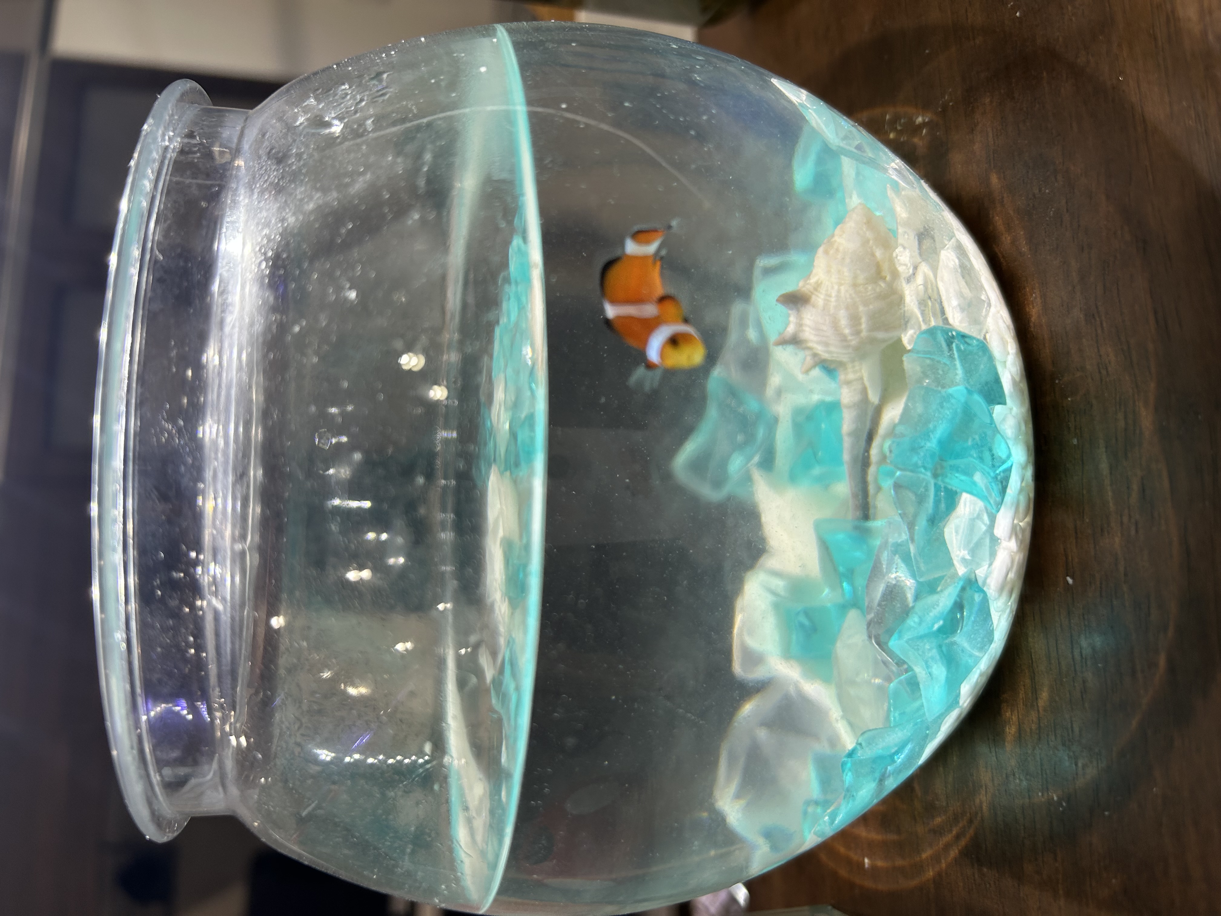 作品コンセプト:気品があってかわいくて元気でまるで小さな王子様のようなカクレクマノミがより素敵に見えるように、引き立て色の水色のキラキラ石と、とうめいなお星様のキラキラ石を敷きつめ、貝殻を飾りました。