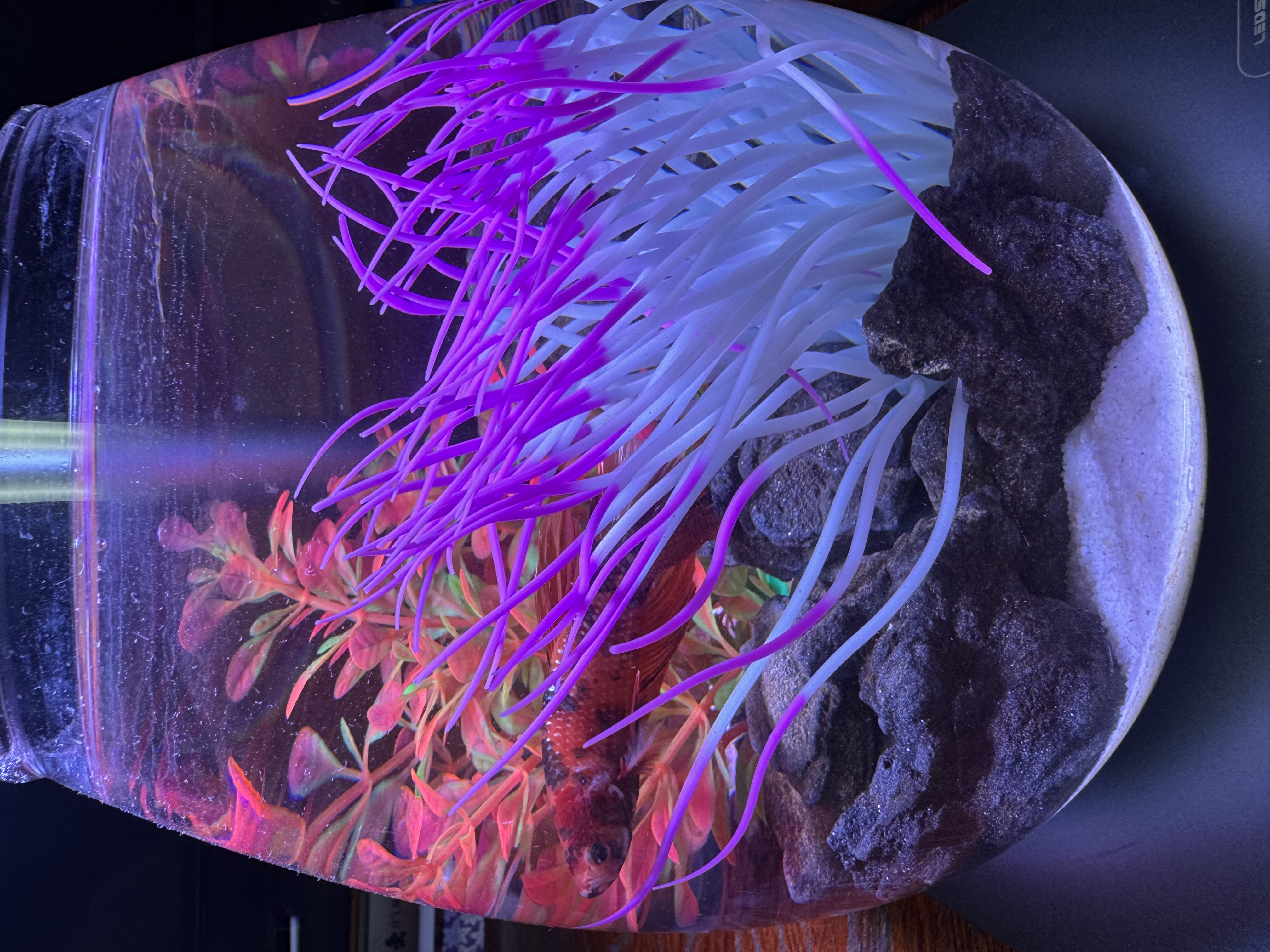 作品コンセプト:ニモ(カクレクマノミ)を小さな水槽で飼いたい人は多いと思うけど、調べれば調べるほどそのハードルは高く、諦める人が多いと思います。そこでニモと呼ばれるカラーを持つベタとマリンアクアリウム用のオブジェを組み合わせることで、なんちゃってマリンアクアリウムにしてみました!今回は存在感を出すためにジャイアントベタを泳がせていますが、通常のベタにすれば余裕を持って飼育することも可能です。また、ライトは青と赤を強く緑を弱くすることで、よりマリンアクアリウムの雰囲気を感じられるようにしました!
